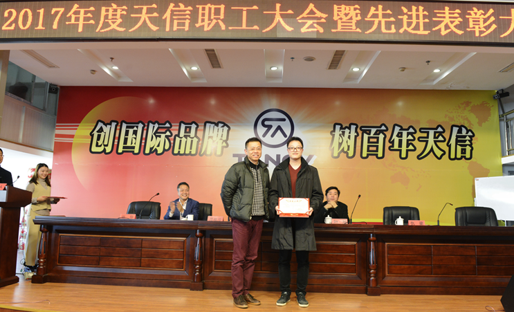 2月5日,2017年度天信職工大會暨先進表彰大會在公司二樓大型會議室召開,會議由副總裁張華主持,公司總裁范叔沙,副總裁葉朋、仇梁以及全體員工共360多人參加。本次會議既是一次總結表彰會,也是一個繼往開來的動員會。